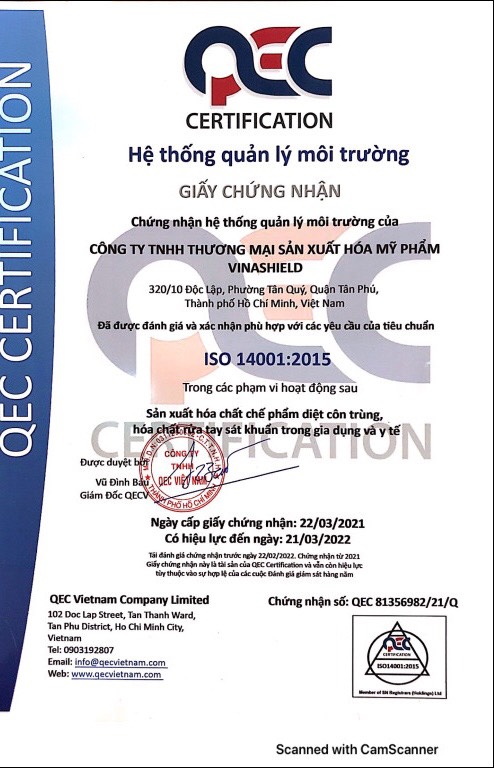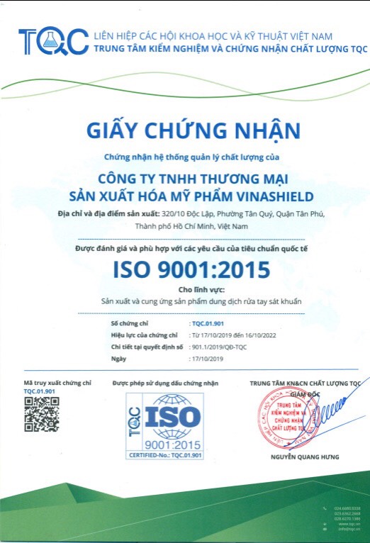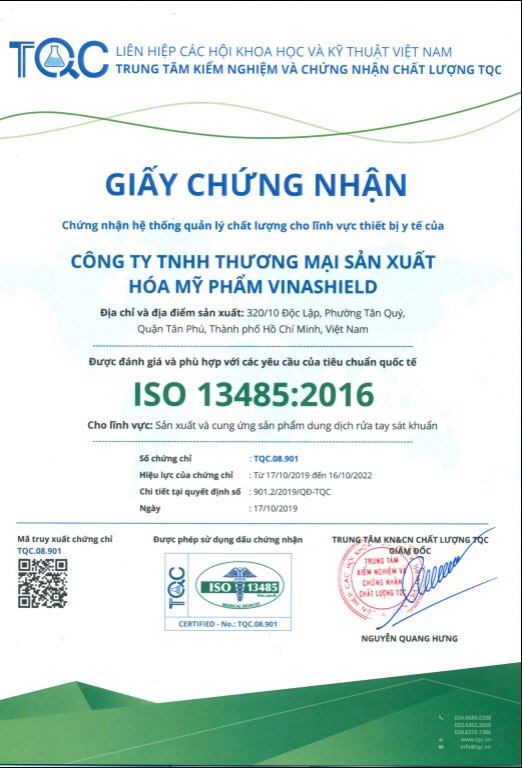 ** Tính đến hiện tại Vinashield là công ty đầu tiên sở hữu 3 ISO & được Bộ Y Tế cấp phép lưu hành.